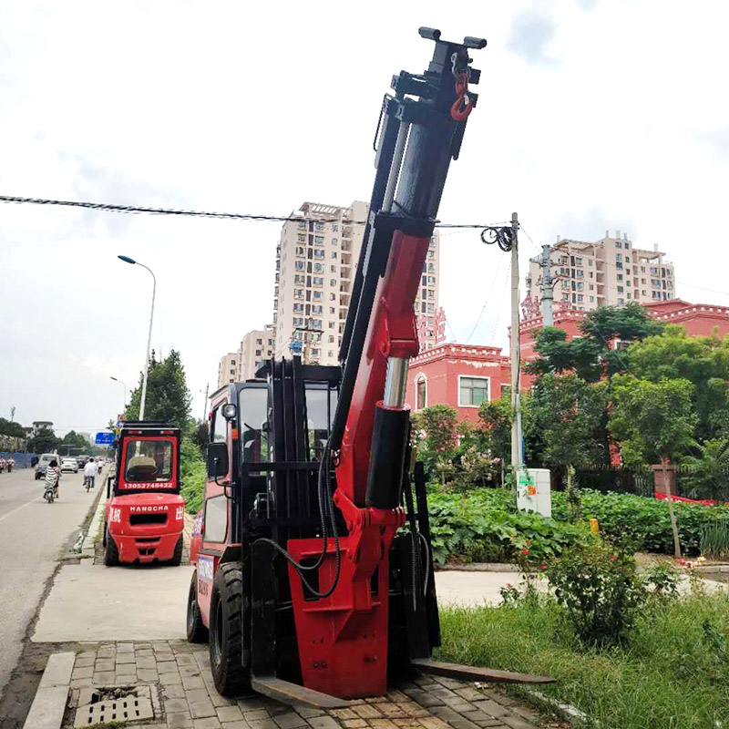 叉車飛臂吊可擺動角度實現(xiàn)低空,高空取物。吊臂油缸驅(qū)動伸縮實現(xiàn)設(shè)備貨物定位。